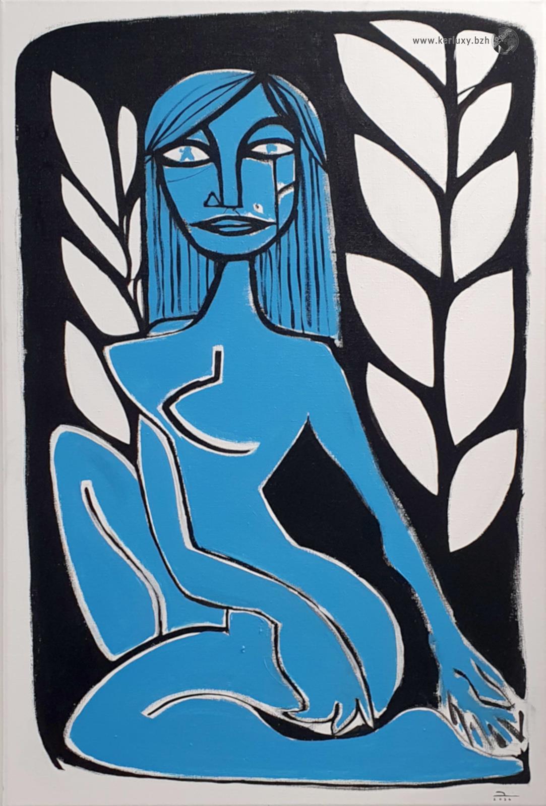 Découvrez Déméter, une oeuvre audacieuse sur fond noir, où le bleu vibrant magnifie le corps féminin nu, sublimé par l'énergie du cubisme.